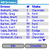 | | The All Drivers screen allows you view all the drivers on file. You can tap the titles Driver, # and Make to sort the list in that order. Tap the Edit button to add/edit the driver information. Tap the Schedule button to return to the race schedule. | All Drivers