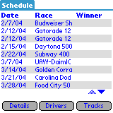 | | The first screen that appears is the Race Schedule screen. Select the Details button to add/edit enter a new race. Once you have some races entered they will display on this screen. The 2010 NASCAR Nextel Cup schedule is provided with the installation. Select a race in the list to edit/delete the entry. Select the Drivers button to view the Nextel Cup drivers. Select the Tracks button to add/edit/view the race tracks. The current tracks for the 2010 season are provided with the installation. You can tap the Date title to sort the data in date order. You can tap the Winner title to sort the data by winner in date order. | Schedule
